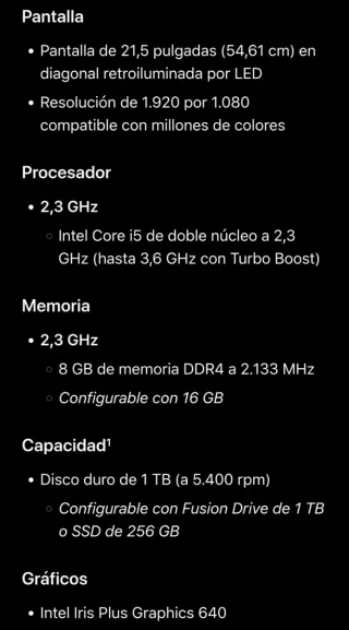 Ordenador Apple iMac de 21,5 pulgadas con pantalla Retina 4K. - Procesador Intel Core i5 de doble núcleo a 2,3 GHz (hasta 3,6 GHz con Turbo Boost). - 8 GB de memoria DDR4 a 2.133 MHz (configurable con 16 GB). - Disco duro de 1 TB (a 5.400 rpm) o configurable con Fusion Drive de 1 TB o SSD de 256 GB. - Gráficos Intel Iris Plus Graphics 640.vendo u cambio por algo de mi interes drone dji mini 2 u 3 3d camaras bicicletas pc windows consolas xbox X pley rog ally portatil gamer ipad llantas 5x100 u alguna otra cosa que me pueda interesar ,las caracteristicas en las fotos ,esta muy cuidado sin rallones ni marcas