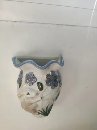 Conjunto de tres macetas colgantes antiguas con un encantador diseño de conejos y flores. - Cada maceta presenta un conejito tierno rodeado de flores. - Borde superior ondulado con detalles en azul. - Ideales para añadir un toque vintage a cualquier espacio.