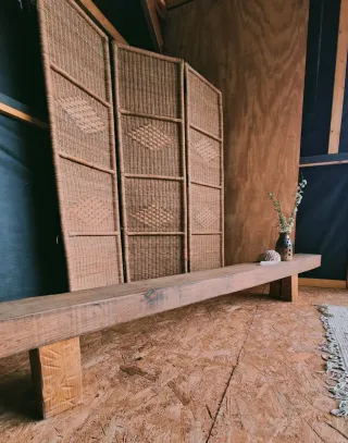 Madera de castaño envejecida. Banco de estilo asiático hecho en ebanistería. Decoración para el hogar.