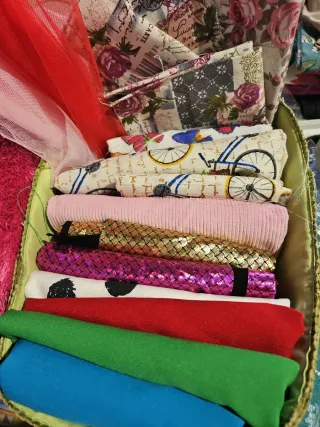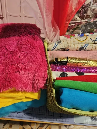 Lote de retales de telas de diferentes texturas y colores. Mayoría de 40cmx2m - Tela de pelo sintético fucsia. - Tela amarilla. - Tela azul. - Tela con estampado de bicicletas. - Tela de pana rosa. - Tela metalizada dorada. - Tela con estampado de escamas moradas. - Tela roja. - Tela verde. - Tela azul.