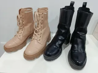 Lote de dos pares de botas para mujer. - Un par en color beige con cordones y detalles de tejido. - Un par en color negro, estilo motero con elástico lateral.