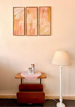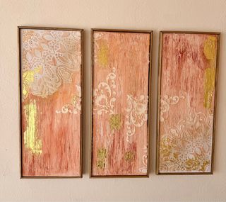 Set de 3 cuadros decorativos modernos hechos a mano. Diseño abstracto en tonos rosa, beige y dorado. Quedan muy bonitos en salón, dormitorio o pasillo. 📏 Medidas de cada cuadro: 21 x 51 cm Se venden juntos como conjunto. Decoración elegante y original.