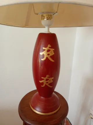 Elegante lámpara de mesa con un diseño oriental. Su base combina un profundo color burdeos con detalles dorados, y la pantalla es de tela en tono crema. - Base con motivos orientales en dorado. - Pantalla de tela en color crema.