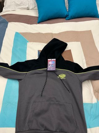 Sudadera de la marca Syna World, con un diseño moderno y detalles llamativos. - Combinación de colores gris y negro. - Cierre con cordones en la capucha. - Bolsillo frontal tipo canguro. -Sudadera nueva no tiene uso viene con ETIQUETA