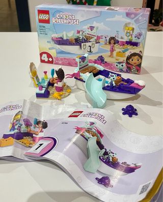 Set de construcción LEGO 10786 de Gabby y MerCat. - Incluye figuras de Gabby, MerCat y otros personajes. - El set cuenta con un barco que flota. - Diseñado para niños a partir de 4 años. - Solo falta la pieza que sale en la última foto, la peluca Lila