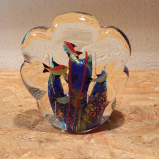 Precioso adorno de cristal con un diseño de acuario y peces. - Figuras de peces de colores. - Base con detalles de coral y algas. - Acabado transparente con reflejos.