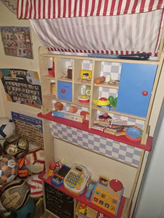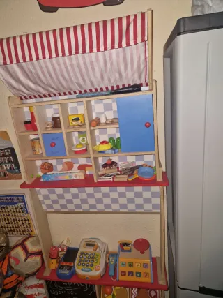 Tienda de madera para que los niños jueguen a la tienda o al mercado. - Estructura de madera. - Techo a rayas rojas y blancas. - Incluye accesorios de juego como caja registradora, balanza y alimentos de juguete.