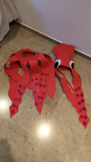 Disfraz de calamar hecho de fieltro y goma Eva, rojo, ideal para fiestas o eventos. - Diseño con tentáculos. - Adornos circulares brillantes en los tentáculos. - Independiente para adult@ o niñ@