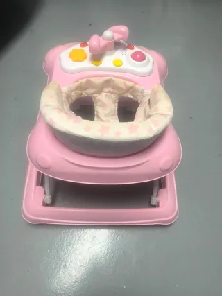 Andador para bebés en color rosa, con un divertido centro de actividades. - Asiento acolchado con estampado de estrellas. - Centro de juegos con botones y volante. - Estructura de plástico resistente.