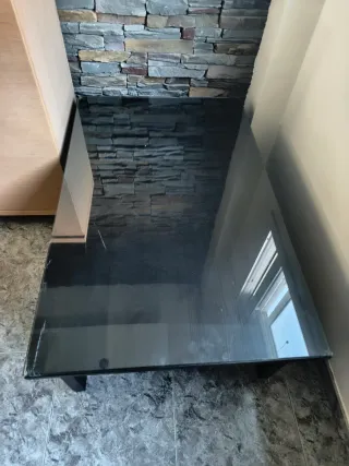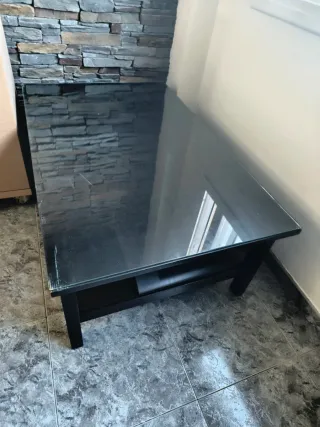 Mesa de centro de comedor de madera color oscuro con cristal superior. Medidas 118cm x 47 (altura) x 75 (ancho)