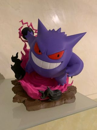 Figura coleccionable del Pokémon Gengar. Representa al Pokémon con una pose dinámica y detalles en su base. - Color morado característico. - Ojos y sonrisa distintivos. - Base con efectos de energía y roca. - No envio