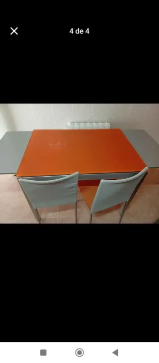 Conjunto de mesa de cocina con sobre de cristal naranja y dos sillas. - Mesa con estructura metálica. - Sillas con asiento y respaldo de tela. Solo en persona,no se envía..precio algo negociable