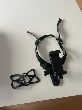 Accesorio para sujetar tu móvil a un casco de moto. Incluye un soporte con correas ajustables y un accesorio de goma para sujetar el movil. Ideal para grabar tus rutas con el movil. - Soporte negro para móvil. - Correas de sujeción negras. - Accesorio de goma negro.