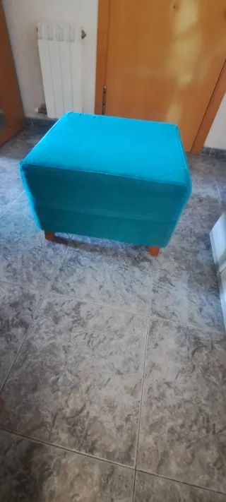 Este puff cuadrado tiene un bonito color azul verdoso. - Tapizado en tela. - Patas de madera.