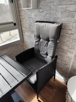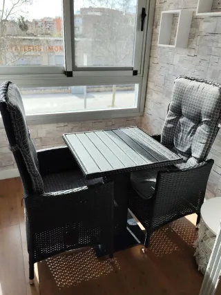 Conjunto de mobiliario de exterior para crear un espacio de relax. - Mesa de centro con superficie texturizada. 60x60cm - Dos sillones con cojines a cuadros. - Sillones reclinables - Muy cómodos