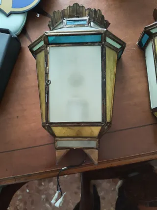 Elegantes apliques de luz de estilo vintage, perfectos para añadir un toque clásico a tu hogar. Se encuentran en buen estado. - Diseño octogonal con detalles dorados y turquesa. - Paneles de cristal esmerilado y de colores. - Estructura metálica robusta. - Uno 30€ los dos 50€. No hago envíos.
