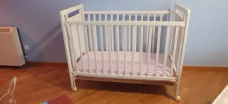 Cuna blanca de madera con colchón y chichonera, una de las barras se baja y tiene dos alturas. Tiene uso pero está bien. Se regalan mantas y sábanas - Estructura de barrotes. - Incluye colchón con muy poco uso. - Incluye chichonera.