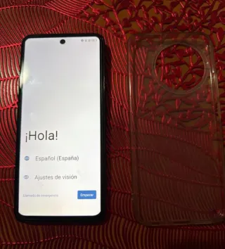 Teléfono móvil de la marca TCL. - Pantalla en blanco. - Opciones de idioma y ajustes de visión.