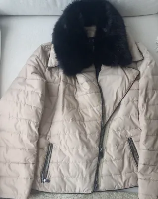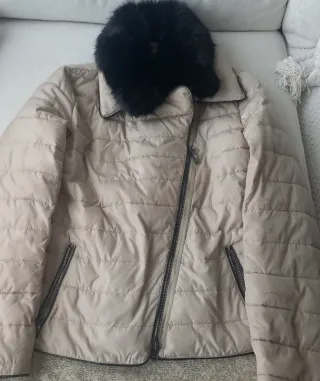 Elegante cazadora de Armani Jeans para mujer en color beige. Presenta un diseño acolchado y un cuello de pelo sintético negro. - Cuello desmontable de pelo sintético. - Cierre de cremallera. - Bolsillos laterales con cremallera. Talla 42 pero talla pequeña