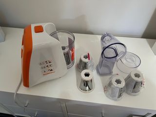 Picadora Silvercrest en buen estado, utilizada solo 3 veces. Incluye varios accesorios para diferentes tipos de corte. - Diseño compacto y funcional. - Color blanco y naranja. - Accesorios de corte incluidos.