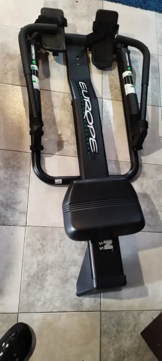 Máquina de remo Proaction Europe con diseño robusto. - Asiento acolchado. - Reposapiés ajustables. - Estructura metálica negra.
