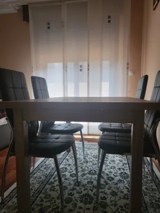 Conjunto de mesa de comedor con cuatro sillas. - Mesa con superficie de madera. - Sillas con tapicería sintética y estructura metálica.