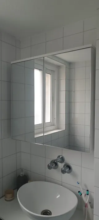 Mueble de baño con espejo y un estante