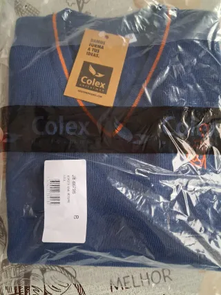 Jersey azul de la marca Colex Uniformes, modelo Ana Mogas. - Talla 8. - Cuello en V con ribete naranja. - Logo de Colex bordado en la etiqueta. - Composición: 50% Algodón, 50% Poliéster.