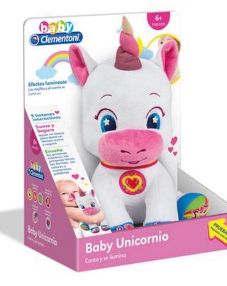 Un tierno unicornio de peluche con detalles coloridos. - Cuerno en espiral con punta amarilla. - Orejas y lazo en color rosa. - Collar multicolor con un corazón amarillo y rosa. - Patas delanteras con diseños de nubes, estrellas y arcoíris. - Patas traseras con números y letras. No tengo la caja