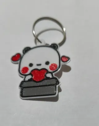 Lindo llavero con diseño de panda sosteniendo un corazón rojo. - Figura de panda blanco y negro. - Detalles de corazón rojo en las manos y en el centro. - Base gris que simula una caja. Se puede enviar por correo pago por bizum