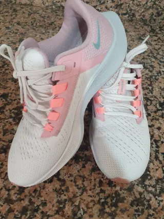 Zapatillas deportivas Nike en talla 40. Combinan blanco gris y rosa con detalles en azul. - Diseño moderno y deportivo. - Cierre con cordones. - Suela blanca.