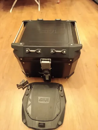 Baúl Givi Trekker Outback de 42 litros. Ideal para equipar tu moto. Incluye: -dos llaves originales -parrilla / soporte trasero Givi monokey - Color negro. - Fabricado en aluminio. - Sistema de anclaje Monokey. Solo tiene un pequeño roce en una esquina(foto) ni bolladuras ni golpes