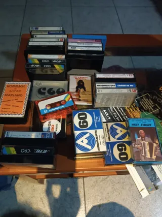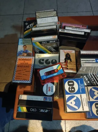 Lote de cintas de cassette de diferentes marcas y duraciones, listas para grabar tus audios favoritos. - Incluye cintas de 90 y 60 minutos. - Variedad de marcas como AGFA, ACME y AUDIOMASTERS. - Algunas cintas tienen fundas o cajas originales.