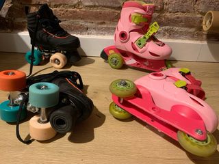 patines para niños. - Patines en quad negros con detalles naranjas y ruedas turquesas. Poco uso. num 29. Precio 25€. Regalo casco. - Patines en linea que para los principiantes se pueden poner en posición triciclo. Rosas con ruedas amarillas. Evolutibos, se adapta a la talla 26, 27 y 28 con el sistema de bota de decathlon. Con signos de uso. funcionan perfectamente. Precio 5€. Regalo casco. Precio por los 2 pares 25€. Regalo 2 cascos.