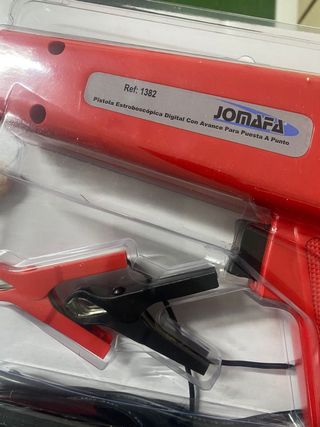 Pistola estroboscópica digital Jomafa, modelo Ref. 1382, sin estrenar. Viene en su embalaje original. - Diseño en color rojo. - Incluye pinzas de conexión (roja y negra). - Cable de alimentación.