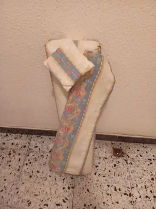 Cojín de bolillos. - Tejido con estampado floral. - Tonos neutros y azules. Dimensiones: Largo 70 cm Diámetro 15 cm *Cojín agujas a juego,tela protectora y bolsa transporte