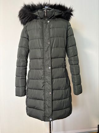 Abrigo acolchado de mujer en tono verde oscuro. Cuenta con capucha y detalles de pelo sintético. - Cierre de cremallera y botones. - Bolsillos laterales. - Diseño largo y acolchado.