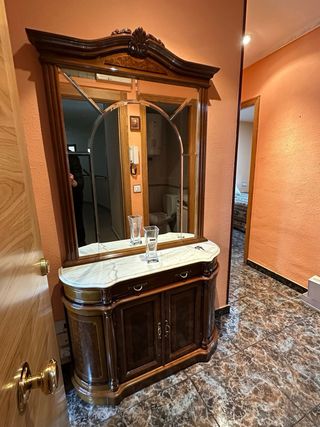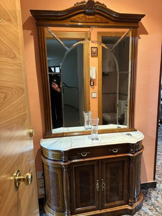 Elegante recibidor de entrada con un diseño clásico y acabados de calidad. - Encimera de mármol. - Mueble inferior con puertas y cajones. - Espejo con marco de madera tallada. - Detalles dorados.
