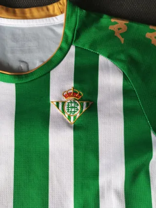 Camiseta de fútbol del Real Betis Balompié. - Diseño a rayas verdes y blancas. - Logo de Kappa en mangas y pecho. - Escudo del equipo. - Parche de LaLiga.