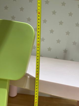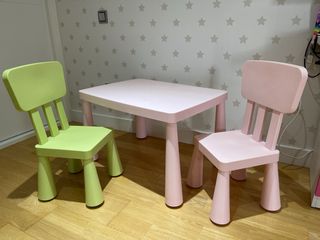 Conjunto de mesa y dos sillas infantiles de Ikea. Ideal para que los más pequeños jueguen y aprendan. - Mesa de color rosa (76cm largo, 54cm ancho y 48cm alto) - Silla de color verde. - Silla de color rosa. En muy buen estado, uso normal de niños
