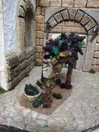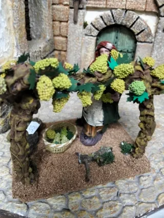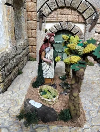 Figura decorativa de un pastor recogiendo uvas. Ideal para belenes o dioramas. - Pastor con túnica y manto. - Cesta de mimbre con uvas. - Uvas en racimos y en el suelo. Pastor , cogiendo uvas. Medida 13 cm.