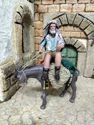 Figura de belén de un pastor montado en un burro. Ideal para completar tu escena navideña. - Figura de pastor con vestimenta tradicional. - Burro detallado con carga. - Base de piedra y camino. Pastor de 13/14 cm