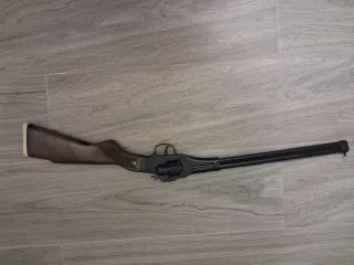 Escopeta de juguete clásica, ideal para coleccionistas o para revivir la infancia. - Diseño tipo revólver. - Culata de plastico imitando madera. - Cañón largo.