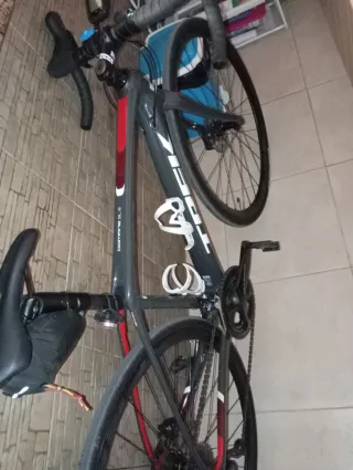 Bicicleta de carretera Trek Domane SL5 en color gris y rojo. Ideal para rutas largas y exigentes. - Cuadro de carbono. - Frenos de disco. - Transmisión Shimano. - Ruedas de perfil.