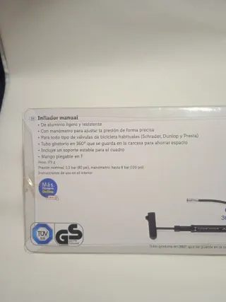 Inflador manual para bicicletas de la marca Crivit. Incluye manómetro para medir la presión. - Presión nominal: 5,5 bar (80 psi). - Válido para válvulas Schrader, Dunlop y Presta. - Mango plegable en T para un mejor agarre. - Garantía de 3 años. Hago envíos por Wallapop.