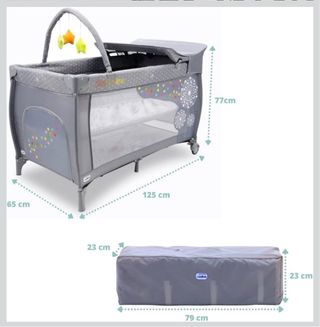 Parque cuna de viaje de la marca Asalvo. Es un espacio seguro y cómodo para los más pequeños. - Diseño en color gris. - Incluye un arco de juegos con estrellas. - Laterales de malla para ventilación. - Ruedas para facilitar su movilidad.