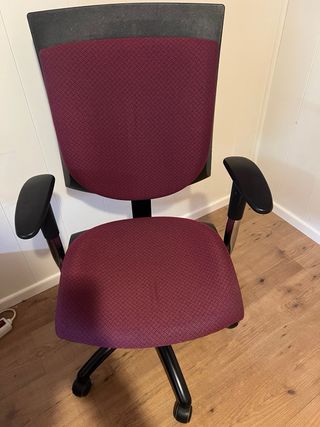 Silla de escritorio con un diseño moderno y cómodo. - Respaldo y asiento tapizados en tela púrpura. - Base y brazos de plástico negro. - Ruedas para fácil movilidad.