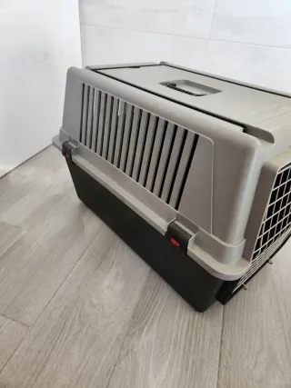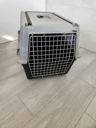 Transportín de plástico resistente para mascotas. - Puerta de rejilla metálica. - Asa superior para facilitar el transporte.