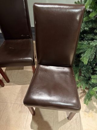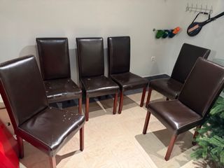Se venden 6 sillas de comedor con tapicería de piel y estructura de madera. - Tapicería de piel en color marrón. - Patas de madera.
