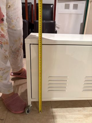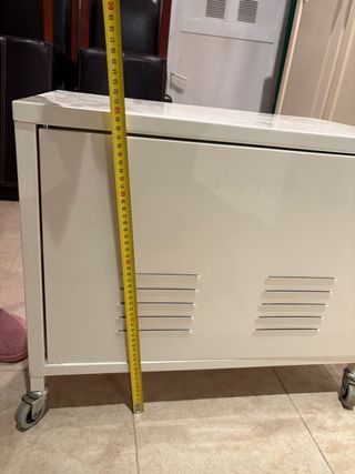 Mueble de almacenamiento con un diseño moderno y funcional. - Acabado en color blanco. - Construcción robusta en metal. - Puerta de acceso. - Ruedas para fácil movilidad.